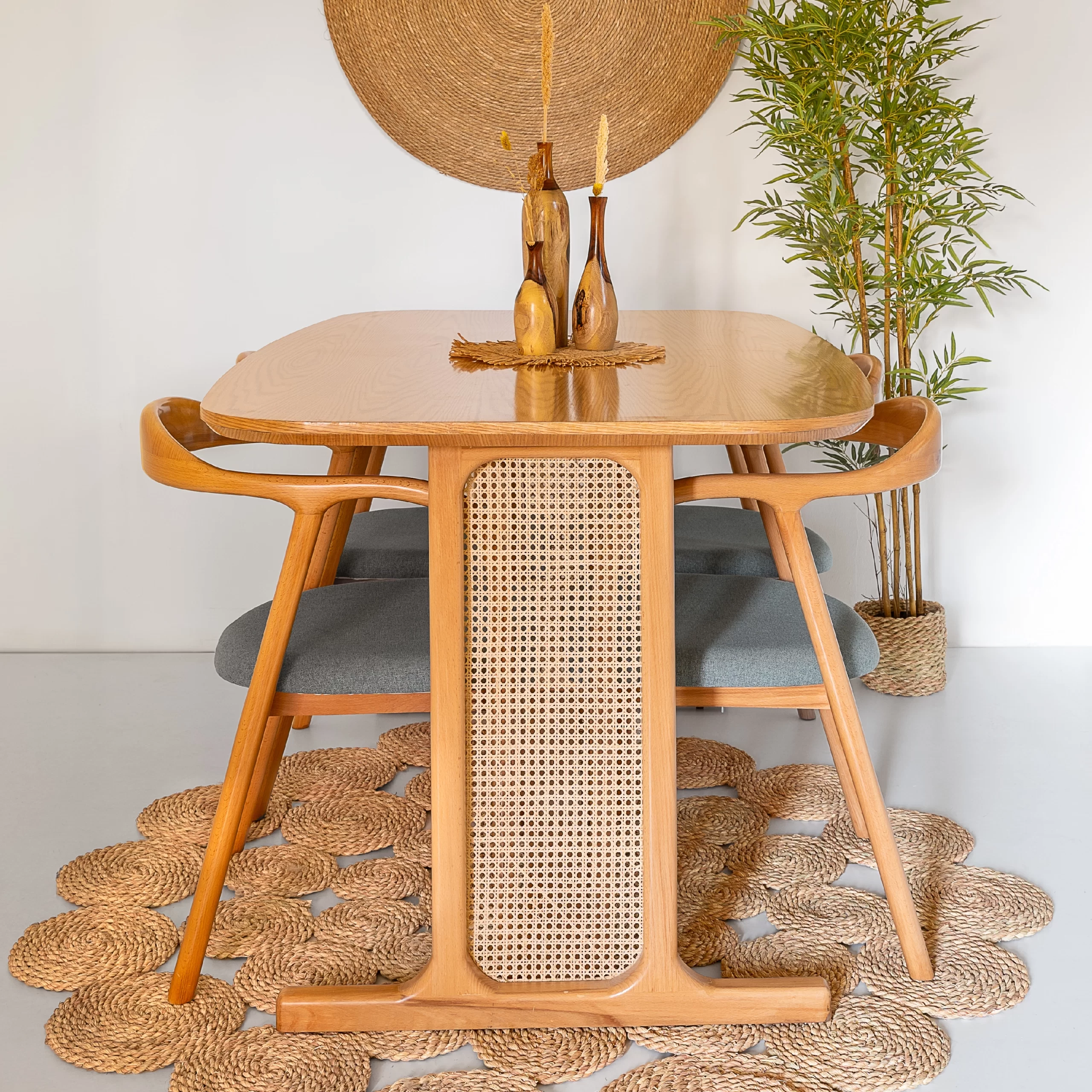 This elegant dining table exudes a bohemian charm that will add warmth and character to your dining space. Crafted with a blend of natural materials and modern design. The table has a warm honey-toned oak veneer top and a light brown beech wood base. This table is both functional and visually appealing. Dimensions: 140x90x75cm.