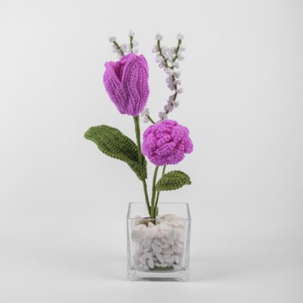 A captivating blend of sky blue, royal blue, yellow, and pearl tones of hand-crocheted flowers Showcased in a stunning royal blue crystal twist vase measuring  14×14×53 cm.