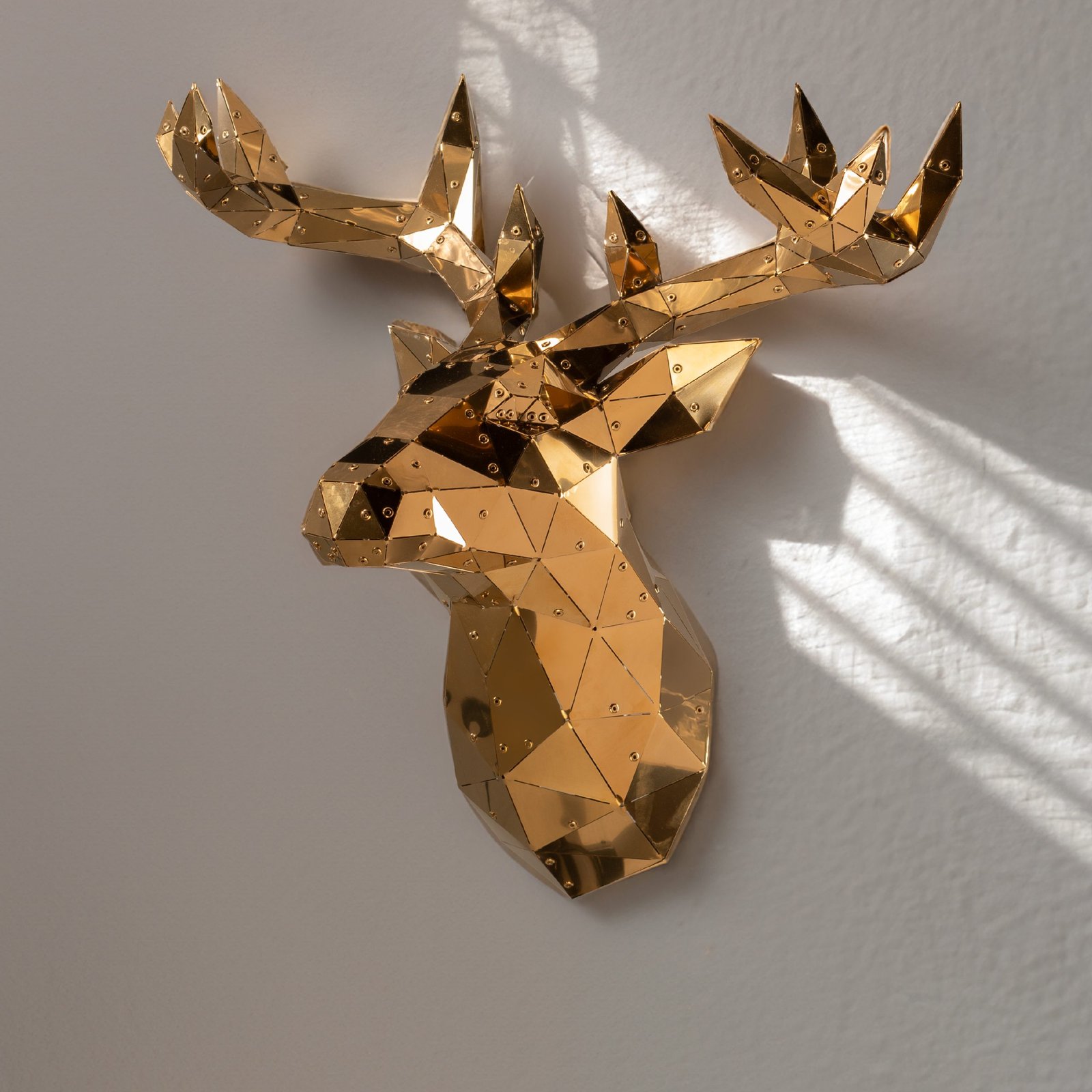 This captivating steel gold statues depicts a majestic deer head, its form rendered in a dynamic and angular style. The artist has employed a bold and expressive use of line and shape to capture the essence of the animal’s powerful presence. The sculpture’s gold finish adds a touch of luxury and elegance, while the intricate details of the antlers and fur are rendered with precision and care. Dimensions: 70×55.2×42.7cm.