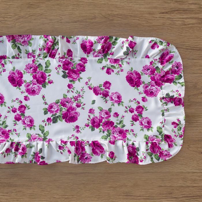Indulge in our floral fabric table runner, adorned with charming ruffles along its edges, adding elegance and charm to any table setting. Color: White.