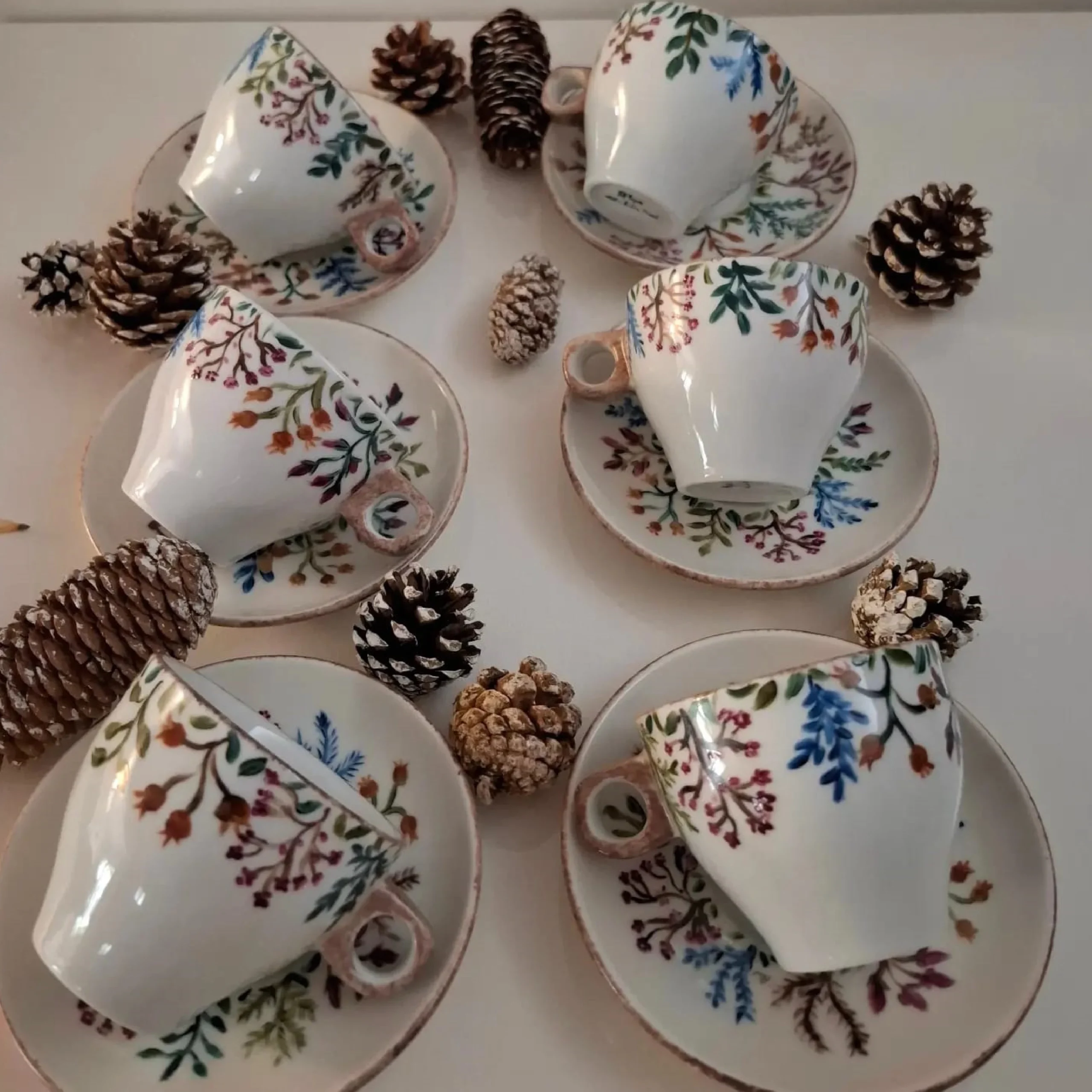 طقم الشاي المرسوم يدوياً ده هو إضافة ساحرة وأنيقة لوقت الشاي. مصنوع من البورسلين الفاخر، المعروف بمتانته وأناقته. مزين بتصميم رقيق مرسوم يدوياً لزهور وكروم ملونة، الطقم ده بيشع سحر رومانسي وفينتج. البورسلين الأبيض بيتبروز بلمسة دهبي، بتضيف لمسة فخامة للتصميم. الطقم بيشمل ٦ فناجين و٦ أطباق، وده بيخليه مثالي للاستمتاع بكوباية قهوة أو شاي مع الأهل والصحاب. الأبعاد: ٦ فناجين: ٩×٨ سم، ٦ أطباق: ١٤×١٤ سم.