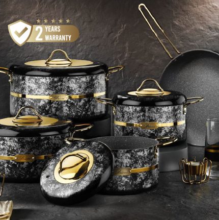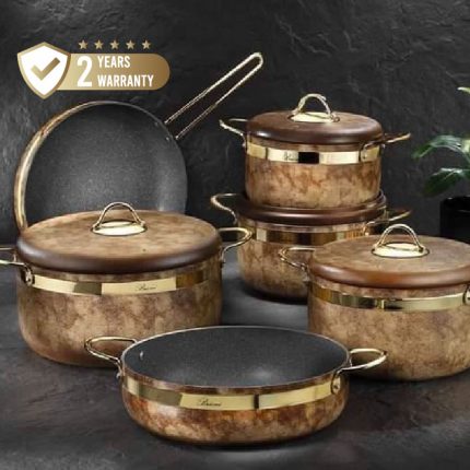 A set comprising 12 pieces, featuring pots ranging in sizes from 18cm to 28cm, along with a 28cm oven tray, a 28cm frying pan, and a 2-litre milk pot. Color: Tiger Eye/Gold. German Technology, 2 years warranty.