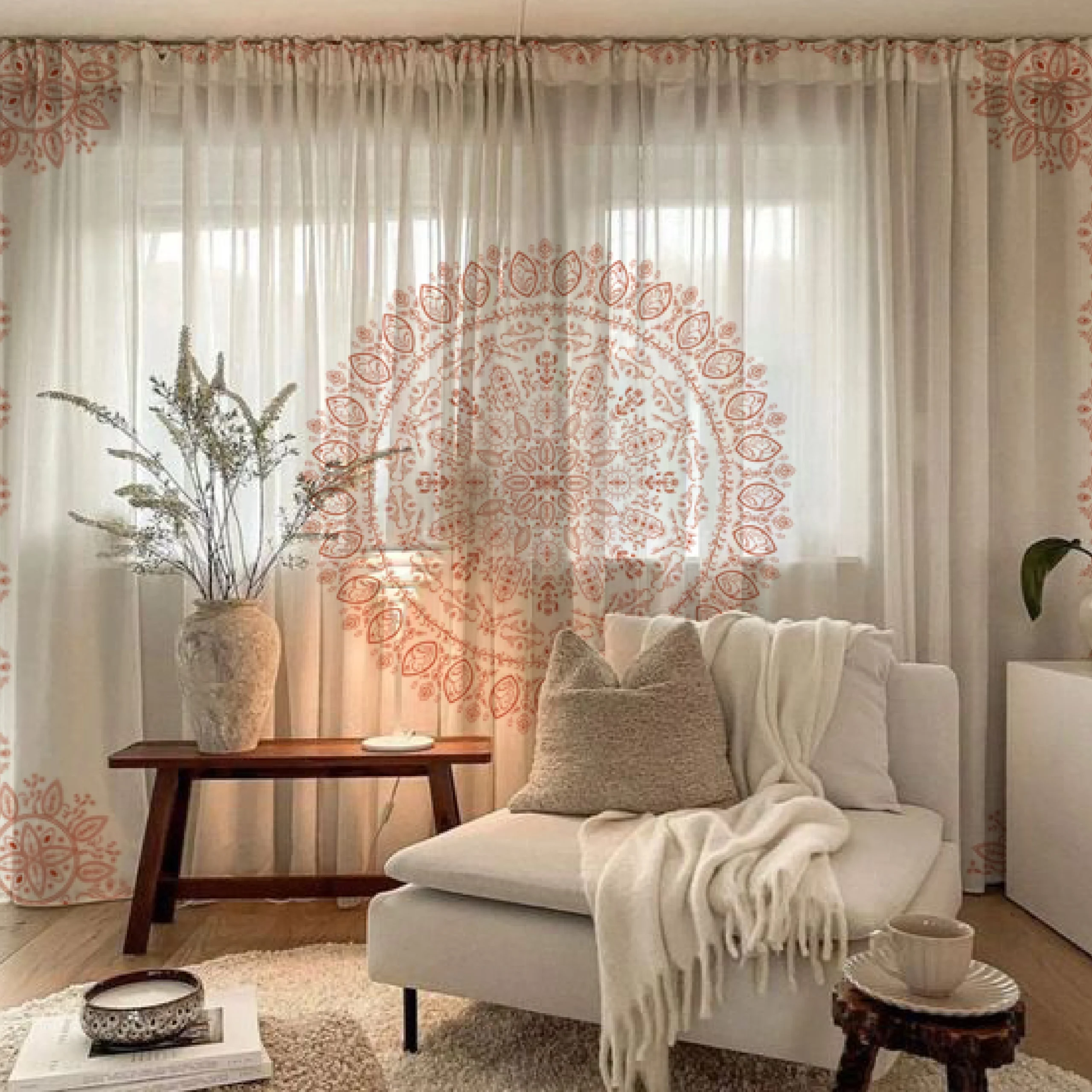 ستارة كتان أوف وايت أنيقة بتتميز بنمط ماندالا مذهل بلون بينك ناعم. القماش الخفيف بيسمح بدخول ضوء ناعم للغرفة مع الحفاظ على الخصوصية. تصميم الماندالا المعقد بيضيف لمسة سحر بوهيمي وأناقة عرقية للستارة، وبيرفع من جمالية المكان ككل. الأبعاد: ٢٧٠×١٣٠×٢٧٠ سم.