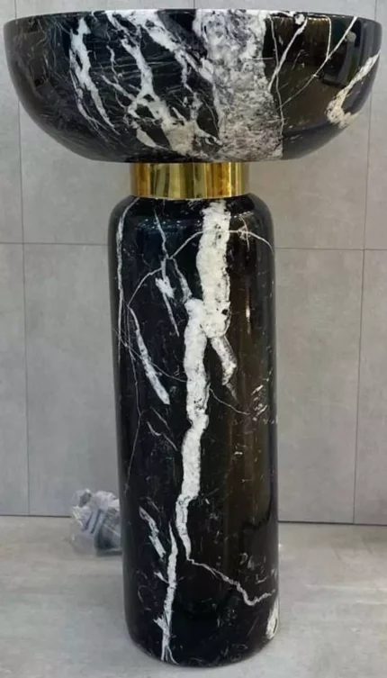 Elegant freestanding sink crafted from premium marble in any marble type, featuring a gold stainless steel ring for a luxurious touch. Perfect for modern and luxury bathrooms.