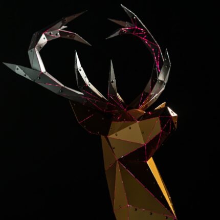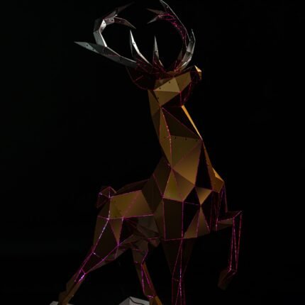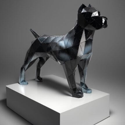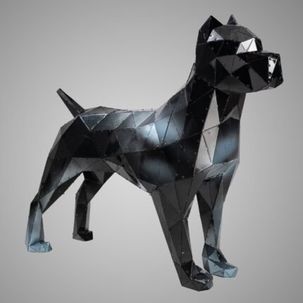 This striking steel black statues depicts a majestic wolf, its form rendered in a dynamic and angular style. The artist has employed a bold and expressive use of line and shape to capture the essence of the animal’s powerful presence. The sculpture’s deep black hue exudes elegance and mystery, while the intricate details of the fur and musculature are rendered with precision and care. Dimensions: 156.6×35.3×127.1cm.